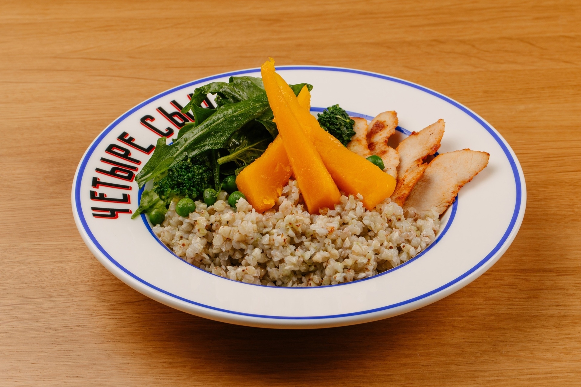 Тёплая зелёная гречка с запечённой тыквой, нежной индейкой, брокколи и зелёным горошком