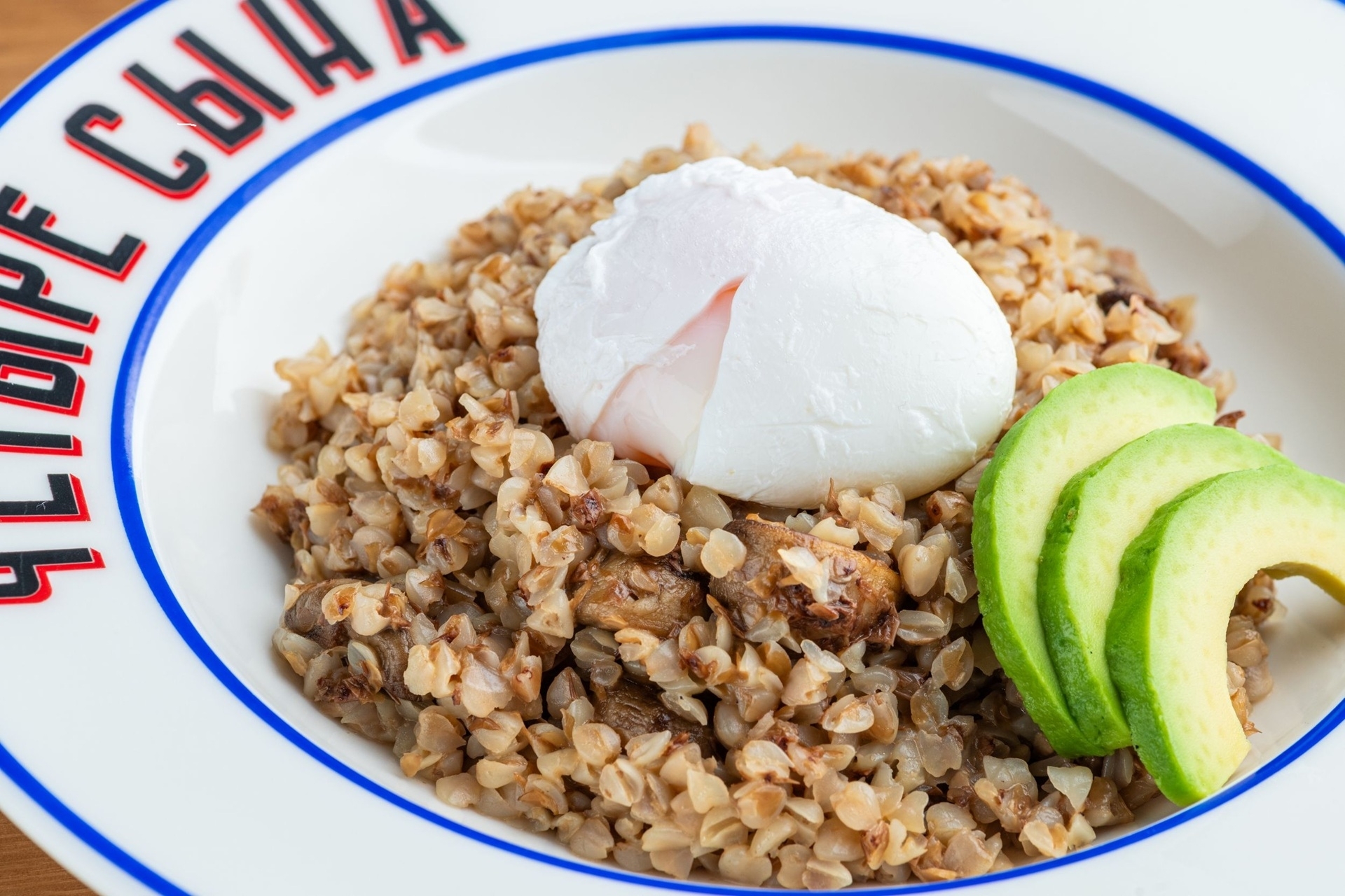 Сливки 33 % , Крупа гречнева, Соль пищевая, Масло растит, Грибы шампиньоны свеж, Яйцо куриное , Соус устричный, Авокадо