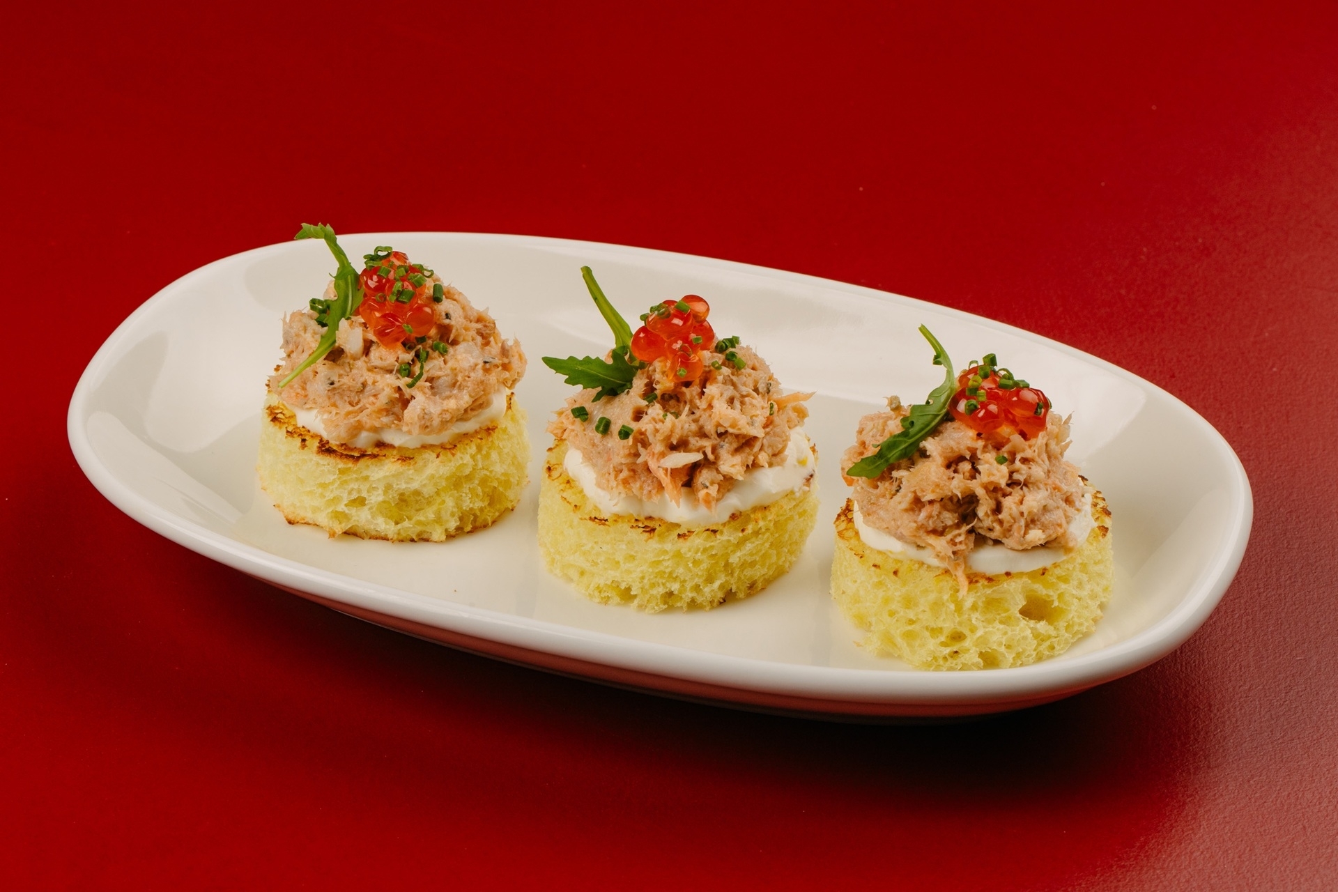 Хрустящая брускетта с нежного риетта из лосося, рукколы и красной икры