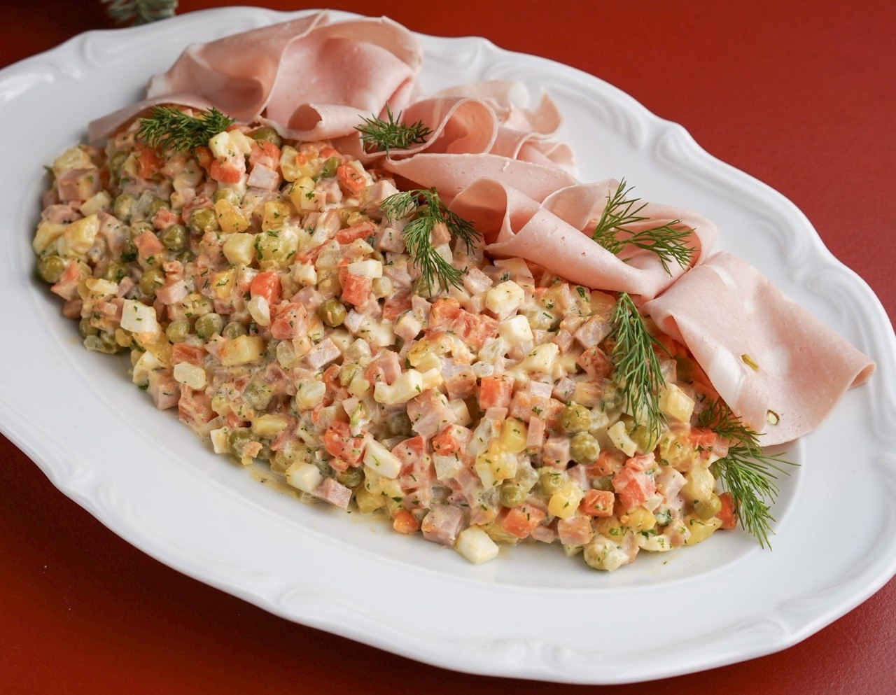Новогодняя классика: нежная мортаделла, свежие овощи и тот самый вкус, без которого праздник как без елки. Картофель, огурцы маринованные, морковь, горошек зеленый консервированный, яйцо, зелень, мортаделла, майонезная заправка с устричным соусом.